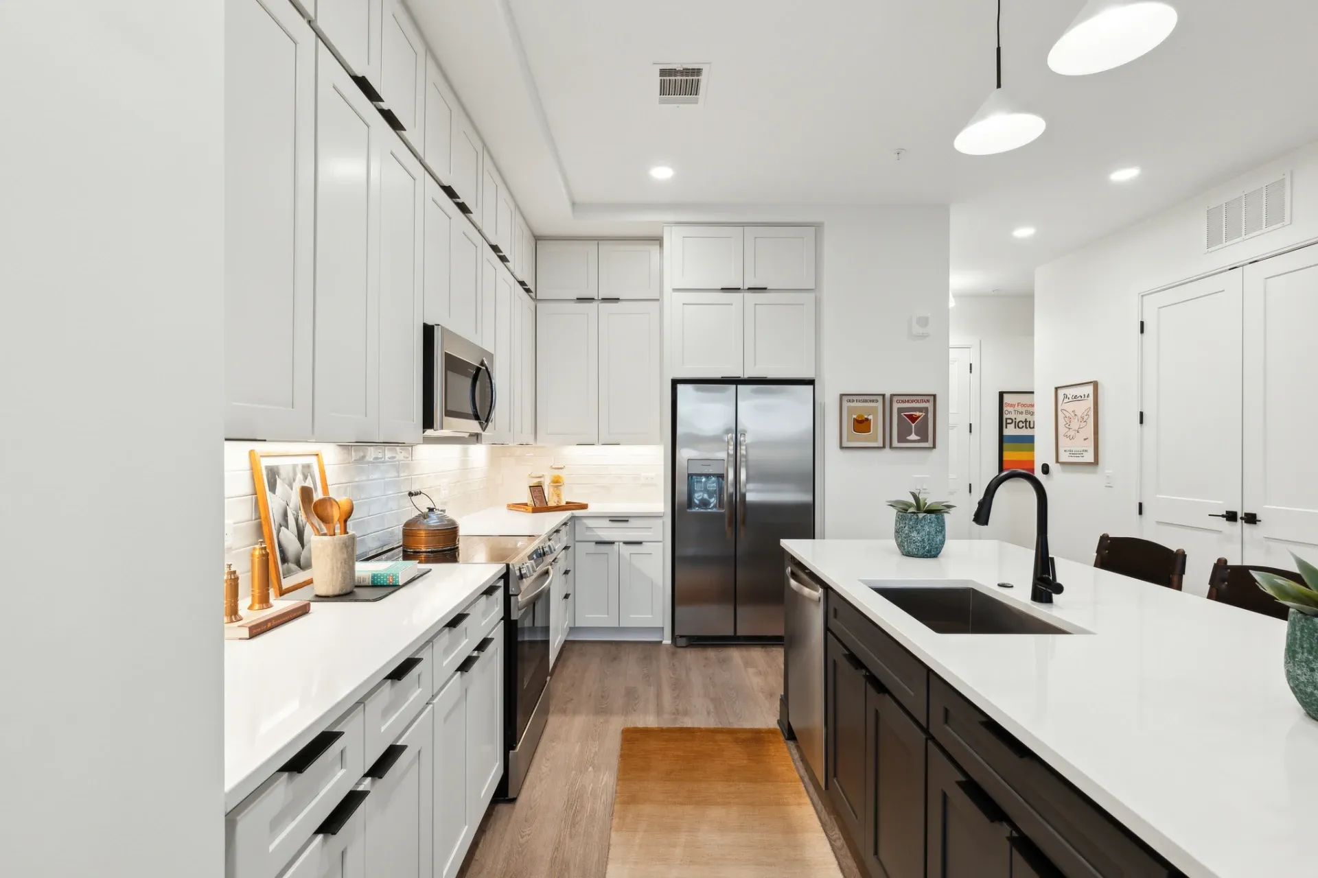 • Quartz countertops, tile backsplashes, and upgraded appliances