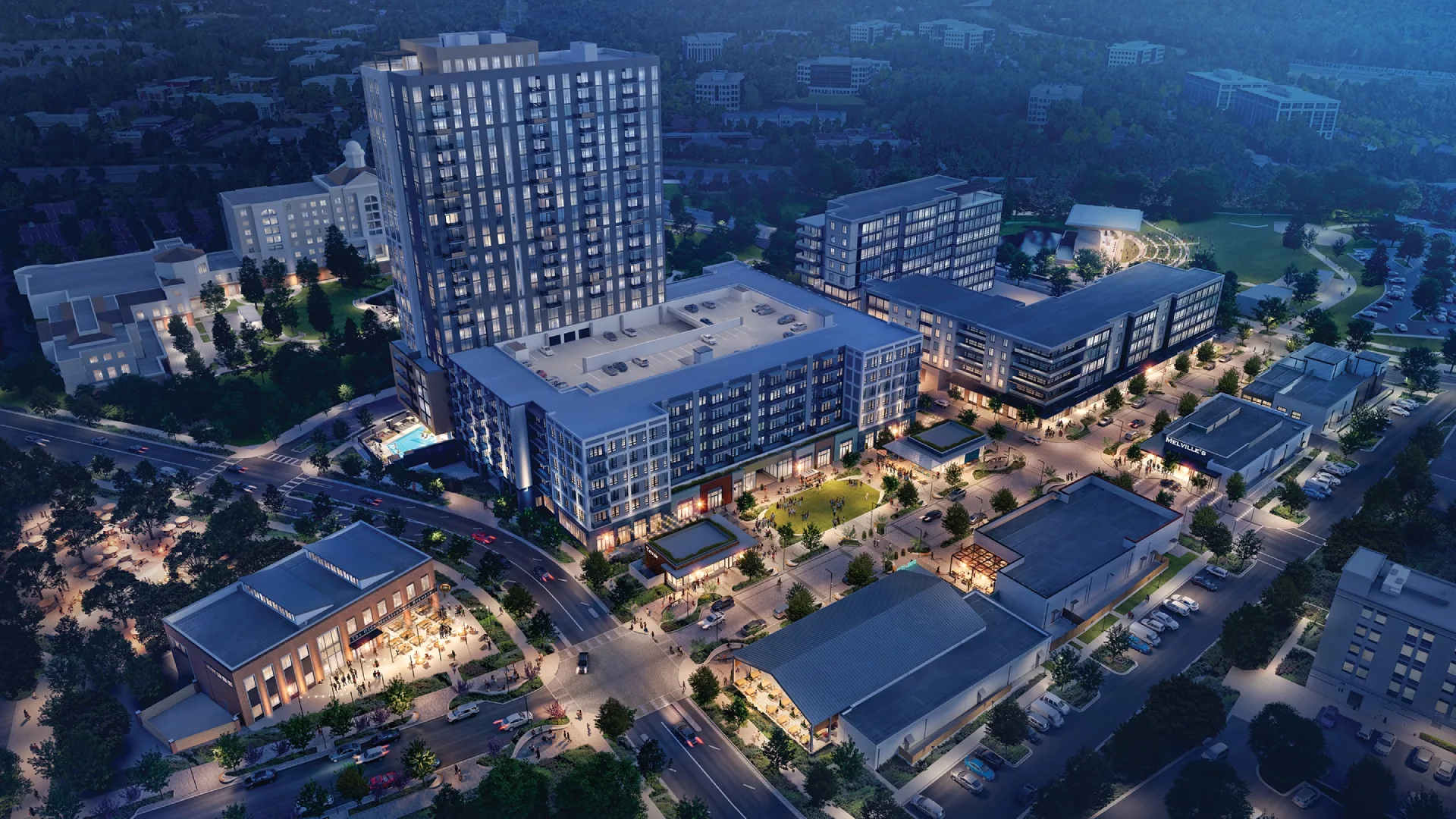 Rendering of The Bowl's street view with retail shops and lush landscaping